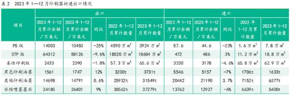 (1)膠印機 1)卷筒紙膠印機 2023年1—12月,中國出口卷筒紙膠印機121臺,金額1957萬美元,金額同比下降25%。出口西班牙8臺,金額270萬美元;出口越南27臺,金額242萬美元;出口意大利7臺,金額231萬美元;出口土耳其11臺,金額194萬美元;出口俄羅斯5臺,金額189萬美元;出口印度尼西亞10臺,金額175萬美元。 2022年1—12月,出口卷筒紙膠印機139臺,金額2714萬美元。其中,出口意大利27臺,金額839萬美元;出口土耳其25臺,金額496萬美元;出口西班牙10臺,金額336萬美元。 2023年1—12月,進口80臺卷筒紙膠印機(包含商業表格輪轉印刷機等商品),金額3182萬美元,金額同比增長114%。從日本進口58臺,金額1540萬美元;從德國進口11臺,金額1387萬美元(其中,2023年7月從德國進口到天津1臺,金額高達1081萬美元);從法國進口7臺,金額228萬美元。日本和德國兩國進口額相加占總進口額的92%。 2)單張紙膠印機(不包含單色膠印機) 2023年1—12月,出口單張紙膠印機1149臺,金額1.6億美元,同比增長38%。其中,出口印度556臺,金額2009萬美元;出口越南87臺,金額1812萬美元;出口日本12臺,金額1454萬美元;出口美國58臺,金額1191萬美元。 2022年1—12月,出口單張紙膠印機544臺,金額1.2億美元。其中,出口美國36臺,金額1815萬美元,金額排名第一。 2023年1—12月,進口877臺,金額6.2億美元。其中,自德國進口4.6億美元,約占總進口金額的3/4;自日本進口1.5億美元。 2022年1—12月,共進口961臺單張紙膠印機,金額6億美元,其中,自德國進口677臺,金額4.3億美元;自日本進口282臺,金額1.7億美元。 (2)柔版印刷機 2023年1—12月,共進口38臺柔版印刷機,金額1780萬美元,金額同比下降42%。其中,從德國進口5臺柔版印刷機,金額1239萬美元,占總進口金額的70%;從意大利進口7臺,金額367萬美元;從日本進口1臺,金額103萬美元;從瑞士進口1臺,金額49萬美元。 2023年1—12月,出口柔版印刷機142臺,金額1.16億美元,金額同比增長16%。出口金額最高的目的地是俄羅斯,118臺,金額2632萬美元;其次是越南114臺,金額876萬美元;沙特131臺,金額733萬美元;意大利10臺,金額555萬美元。 2022年1—12月,出口柔版印刷機2236臺,金額1億美元。其中,出口越南金額最高,524臺,1611萬美元;出口印度195臺,金額758萬美元;出口俄羅斯70臺,金額734萬美元。 (3)凹版印刷機 2023年1—12月,進口凹印機31臺,金額1091萬美元,金額同比下降55%。金額最高的進口來源國依次是日本、韓國和瑞士。其中,從日本進口4臺,金額315萬美元;從韓國進口5臺,金額298萬美元;從瑞士進口3臺,金額228萬美元。 2023年1—12月,出口凹印機1278臺,金額6172萬美元,金額同比下降6%。其中,出口越南303臺,金額1297萬美元;出口印度76臺,金額832萬美元;出口泰國52臺,金額632萬美元;出口印度尼西亞45臺,金額445萬美元;出口日本15臺,金額306萬美元。 2.印刷器材 2023年1—12月印刷器材進出口數據如表2所示。