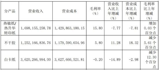 2022年、2023年,冠豪高新的營業收入分別為80.86億元和74.03億元。其中,冠豪高新營業收入前三大產品中白卡紙與不干膠的毛利率均出現大幅下滑的現象。2023年,不干膠和白卡紙營業收入分別為12.52億、36.20億,二者毛利率分別下降5.61%、12.30%。