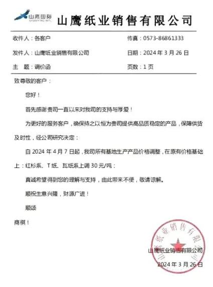對下游瓦楞包裝行業而言,山鷹國際的另一份漲價通知可能更值得關注。4月7日起,山鷹國際所有基地的紅杉系以及T紙、瓦紙系上調30元/噸。
