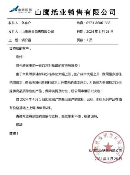 受行業淡季影響,紙業市場每年三月份都會出現降價現象,瓦楞紙、箱板紙、白板紙等各類紙種均在本月有著不同程度下調。如今步入月底,玖龍紙業多個基地降價30-100元/噸,山鷹國際提前喊漲,宣布4月初漲價30-300元/噸。 玖龍紙業多個基地降價30-100元/噸 據知情人士透露,3月27日,玖龍紙業多個基地降價。其中,東莞基地對海龍優質、海龍牛卡、地龍牛卡降價100元/噸;太倉基地對地龍、江龍灰底白板紙降價50元/噸;湖北基地對再生下調50元/噸、對地牛下調30元/噸;沈陽基地對瓦楞、再生、牛卡下調50元/噸。 玖龍紙業本輪降價范圍最廣的基地是天津玖龍。該工廠對玖牛、海牛、白面、涂布下調100元/噸;對地龍優質、海牛B、地牛、江牛、瓦紙130g-170、地龍再生150g-200g下調50元/噸;對地龍再生90g-140g、江再115g-145g、瓦紙80g-125g下調30元/噸…… 除了玖龍紙業外,國內其余紙廠近兩日也紛紛下調紙價,如理文造紙廣東基地、廣西太陽紙業、河南新亞紙業等多地紙廠。這些紙廠的降幅普遍在30元/噸以上,部分紙企的瓦楞紙價位在多次下跌后已接近去年同期低位水平。 山鷹國際宣布4月份漲價30-300元/噸 然而很奇怪的是,在一片下跌聲中,市場卻傳出了兩份關于山鷹國際的原紙漲價函。這家原紙總產能國內排名前三的包裝紙企,將分別從4月1日、4月7日對部分基地作出調漲處理。 具體而言,4月1日起,山鷹國際廣東基地生產的雪杉、云杉、水杉系列產品在原價格基礎上上調300元/噸。據了解,上述漲價的紙種屬于特種紙產品,噸紙價格相對較高,因此300元/噸的漲幅看似驚人,但卻也在可接受的范圍之內。