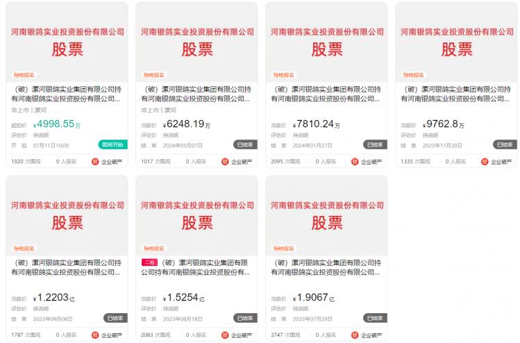 7月8日,大河財立方記者獲悉,河南銀鴿實業投資股份有限公司(下稱“銀鴿投資”)1.54億股股份再次被掛牌司法拍賣,起拍價4998.5萬,7月11日開拍。該拍賣標的為漯河銀鴿實業集團有限公司(下稱“銀鴿集團”)破產涉及的資產。 記者注意到,2023年7月29日以來,該筆股權資產曾多次掛牌,最初起拍價為1.9億,但前六次拍賣均流拍。本次起拍價僅相當于首次拍賣起拍價的26%。