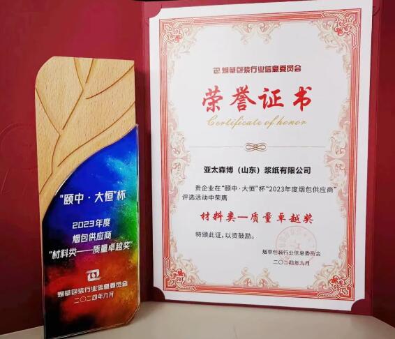 9月11日,2024年煙草包裝最新發(fā)展趨勢研討會暨2023年度煙草包裝系列評選活動頒獎慶典在青島舉行。亞太森博榮獲2023年度煙包供應(yīng)商“材料類——質(zhì)量卓越獎”。