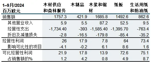 2024年1-9月(2023年1-9月同比數據) 銷售額為42.73億歐元(同比:46.24億歐元) 經營性利潤為1.57億歐元(同比:4.43億歐元);可比經營性利潤為1.7億歐元(同比:4.31億歐元) 稅前利潤為1.19億歐元(同比:4.38億歐元);可比稅前利潤為1.31億歐元(同比:4.3億歐元) 可比已占用資本回報率為3.2%(同比:8.3%) 經營性凈現金流為負1.65億歐元(同比:4.87億歐元) 2024年7-9月(2023年7-9月同比數據) 銷售額為13.36億歐元(同比15.59億歐元) 經營性利潤為1.11億歐元(同比:4100萬歐元);可比經營性利潤為1.13億歐元(同比:5100萬歐元) 稅前利潤為1.0億歐元(同比:4900萬歐元);可比稅前利潤為1.02億歐元(同比:6000萬歐元) 可比已占用資本回報率為6.1%(同比:3.2%) 經營性凈現金流為8700萬歐元(同比:4.69億歐元) 2024年第三季度主要事件 與第二季度相比,芬林集團針葉商品漿的平均銷售價格在歐洲上升了 6%,在中國下降了4%。 在歐洲,紙漿市場形勢良好。在中國,市場需求在第二季度有所減弱,但在第三季度末有所回升。 與第二季度相比,芬林集團的紙板交付量略有增加。平均價格保持穩定。 芬林集團發布了最新的綠色金融框架。之前的框架從2019年開始實施。 7月至9月的可比經營性利潤包含因凱米生物制品廠氣爆獲得的6700萬歐元保險賠償。目前正在繼續與保險聯合會進行談判,以賠償剩余的估計經濟損失。 2024年10-12月的業績預測 芬林集團2024年10-12月的可比經營性利潤預計將低于2024年7月至9月。凱米生物制品廠氣爆的保險賠償(包含在7月至9月的可比經營性利潤中)以及10月至12月期間任何的未來保險賠償均未考慮在業績指導中。2024年7月至9月,芬林集團的可比經營性利潤為1.13億歐元,其中包括6700萬歐元的保險賠償。