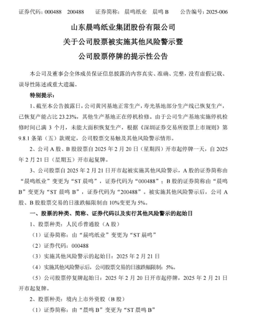晨鳴紙業公告稱,由于公司生產基地實施停機檢修時間已滿3個月,未能大面積恢復生產,根據相關規定,公司股票交易觸及其他風險警示情形。公司A股、B股股票自2025年2月20日開市起停牌一天,自2月21日開市起復牌。A股證券簡稱由“晨鳴紙業”變更為“ST晨鳴”,證券代碼為“000488”;B股證券簡稱由“晨鳴B”變更為“ST晨鳴B”,證券代碼為“200488”。實施其他風險警示后,公司A股、B股股票交易的日漲跌幅限制由10%變更為5%。