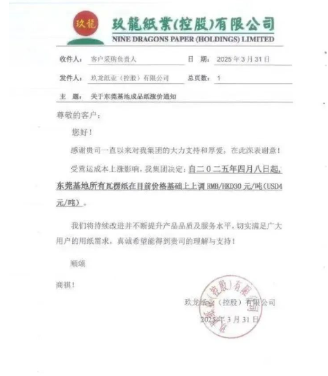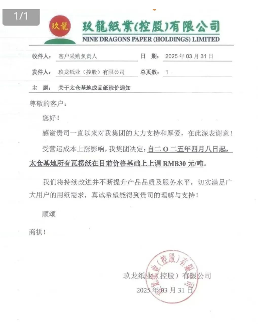 近期國內(nèi)包裝紙市場出現(xiàn)新一輪價格上漲動向。繼東莞區(qū)域部分中小型紙企于上周末試探性調(diào)價30元/噸后,主要紙業(yè)大廠陸續(xù)釋放提價信號。江西理文造紙基地率先發(fā)布通知,計劃于4月7日上調(diào)Q紙與K紙報價30元/噸。幾乎同期,玖龍紙業(yè)東莞、太倉兩大生產(chǎn)基地宣布自4月8日起,瓦楞紙系列產(chǎn)品全線上調(diào)同等幅度。