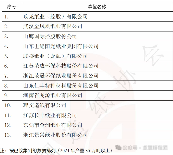 在各細(xì)分產(chǎn)品領(lǐng)域中,2024年箱板紙年產(chǎn)量在50萬(wàn)噸以上的企業(yè)共有14家,分別為玖龍紙業(yè)、山鷹國(guó)際、理文造紙、太陽(yáng)紙業(yè)、江蘇榮成紙業(yè)、山東世紀(jì)陽(yáng)光、聯(lián)盛紙業(yè)(龍海)、浙江景興紙業(yè)、安徽林平紙業(yè)、揚(yáng)州永豐余紙業(yè)、河南龍?jiān)醇垬I(yè)、東莞建暉紙業(yè)、東莞金洲紙業(yè)、山東博匯集團(tuán)。