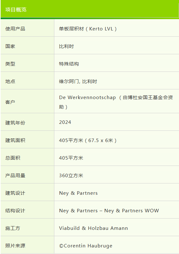 作為布魯塞爾東環路新設計的一部分,一座新的木橋正在維爾阿門 (Vier Armen) 十字路口上方建造,供騎行者和行人通行使用。該橋的主要結構材料為芬林梅沙木業提供的Kerto LVL Q型單板層積材。這座新木橋位于索尼安森林(Sonian forest),跨度達67.5米。選擇Kerto LVL單板層積材的原因在于其卓越的結構性能,這些性能已完全融入到結構設計中。