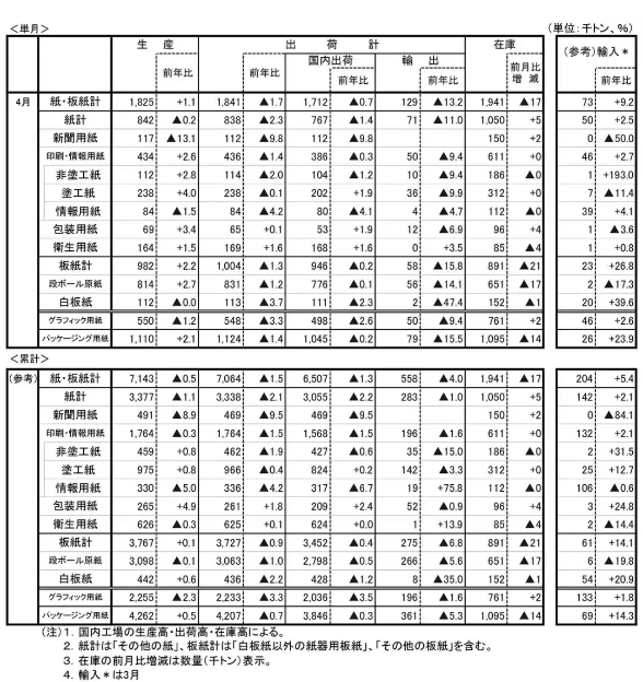根據日本造紙協會發布的2025年4月紙及紙板供需快報,日本國內紙及紙板出貨量同比下降0.7%,為連續第三個月下降。按用途劃分,印刷紙下降2.6%,為連續第六個月下降;包裝紙下降0.2%,為連續第三個月下降。