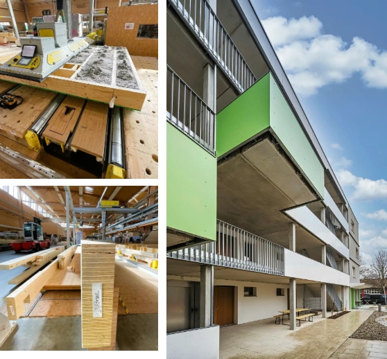 Gumpp & Maier 建筑公司項目經理沃爾夫岡・克萊特瑙(Wolfgang Krettenauer)指出:“Kerto LVL 的高精度在預制環節至關重要。極小的誤差率幫助我們優化全流程,確保高質量構件實現‘零失誤’生產。這些預制墻體構件(含集成窗戶與外立面護墻板)可在現場快速組裝,大幅縮短了整體施工周期。”