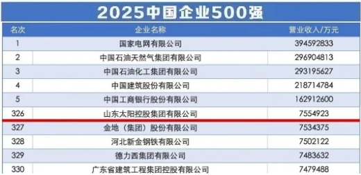 9月15日,中國企業聯合會、中國企業家協會在京召開新聞發布會,發布“2025中國企業500強”榜單。其中,公司控股股東山東太陽控股集團有限公司憑借穩健的經營表現和卓越的綜合實力榮耀登榜,位列第326位,較去年提升10位!