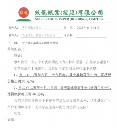 • 玖龍重慶基地 1、自九月二十九日起,重慶基地再生牛卡、瓦楞紙價(jià)格上調(diào) 30 元/噸。 2、自十月九日起,重慶基地所有?(含再生?)、瓦楞紙價(jià)格上調(diào) 50 元/噸。