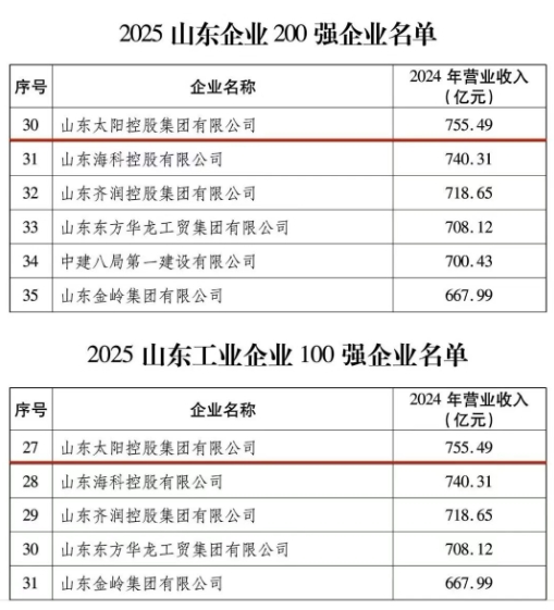 據了解,為全面貫徹黨的二十大和二十屆歷次全會精神,落實省委、省政府關于加快培育更多世界一流企業的要求,進一步促進企業做大做強做優,山東省企業聯合會在連續二十年組織開展山東大企業發展研究工作基礎上,參照國際通用慣例,結合我省實際,依據企業2024年營業收入年報數據(企業集團為合并報表數據),經企業自愿申報、山東省企業聯合會組織審核篩選,確定2025山東大企業名單,并形成《2025山東大企業發展研究報告》。 下一步,太陽控股將繼續深入學習貫徹中共二十屆四中全會精神和中央經濟工作會議精神,把政策支持轉化為發展信心和動力,把戰略部署轉化為實干舉措,在創新驅動中培育新質生產力,在內需拓展中服務民生福祉,以堅定的信心砥礪前行,以務實的舉措融入中國式現代化建設,在濟寧加快邁向萬億城市、打造“七個高地”、建設“十個強市”的宏偉征程中,展現更大作為、作出更大貢獻。