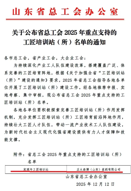 12月12日,在亞太森博(山東)公司管理層的高度重視與全力支持下,由公司工會(huì)牽頭推動(dòng)、漿電氣部?jī)A力共建的“宋琛年工匠培訓(xùn)站”,成功獲評(píng)為山東省總工會(huì)2025年重點(diǎn)支持培訓(xùn)站。這一省級(jí)殊榮的取得,是上級(jí)工會(huì)對(duì)我公司產(chǎn)業(yè)工人隊(duì)伍建設(shè)成果的權(quán)威認(rèn)可,更是對(duì)工會(huì)組織圍繞中心、服務(wù)大局,主動(dòng)作為、切實(shí)履職工作成效的極大褒獎(jiǎng)。