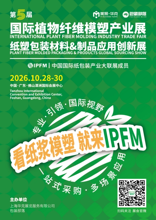 2026年10月28-30日,IPFM2026將在中國·廣東·佛山潭洲國際會展中心隆重舉行!邁入第五屆的IPFM將匯聚行業智慧,以創新驅動新質生產力,賦能紙漿模塑產業轉型升級提速,快速步入高質量健康發展階段;同時積極開拓國際、國內消費應用端商機,彰顯紙漿模塑綠色力量的無限潛力。