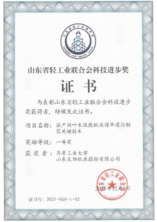 近日,山東省輕工業(yè)聯(lián)合會公布2025年度科學技術獎獲獎名單,太陽紙業(yè)與齊魯工業(yè)大學(山東省科學院)聯(lián)合攻關的“國產(chǎn)闊葉木低能耗高得率清潔制漿關鍵技術”項目,榮獲2025年度山東省輕工業(yè)聯(lián)合會科技進步獎一等獎。