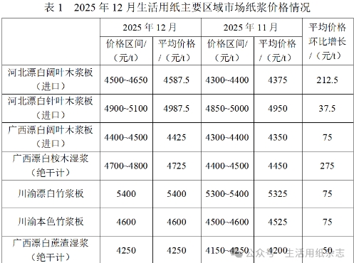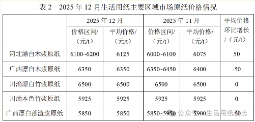 2025年12月生活用紙主要區(qū)域市場紙漿及原紙價格情況