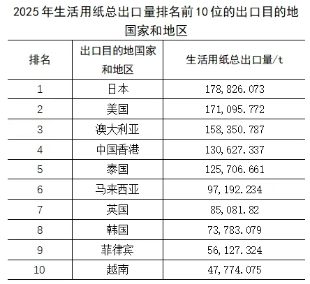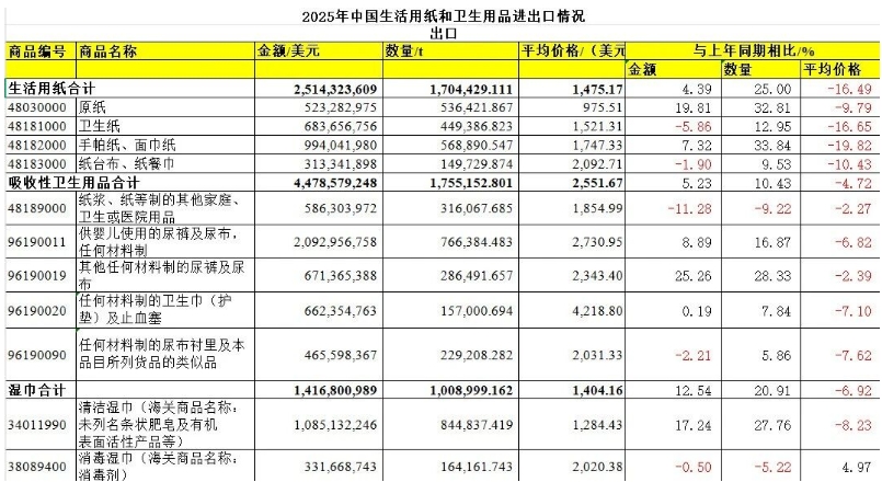 生活用紙 根據(jù)海關(guān)統(tǒng)計(jì)數(shù)據(jù),2025年,中國(guó)生活用紙出口量連續(xù)4年增長(zhǎng),進(jìn)口量雖也有增長(zhǎng),但總量相對(duì)較少。中國(guó)生活用紙市場(chǎng)以出口為主,國(guó)內(nèi)生活用紙產(chǎn)量和產(chǎn)品種類已經(jīng)能夠滿足本地市場(chǎng)需求,進(jìn)口產(chǎn)品對(duì)國(guó)內(nèi)市場(chǎng)影響微小。 出口: 2025年,生活用紙總出口量達(dá)到170.44萬t,比2024年增長(zhǎng)25.00%;出口金額為25.14億美元,比2024年增長(zhǎng)4.39%;出口平均價(jià)格比2024年下降16.49%,出口呈現(xiàn)量增價(jià)減的趨勢(shì)。