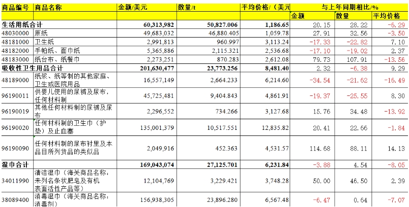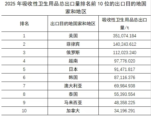 出口的生活用紙仍以成品紙(衛(wèi)生紙、手帕紙、面巾紙、餐巾紙等)為主,占生活用紙總出口量的68.53%。其中,衛(wèi)生紙占總出口量的26.37%,占比呈逐年下降趨勢(shì)(2024年為29.18%,2023年為30.12%),手帕紙、面巾紙的占比為33.38%(2024年為31.17%),在成品紙出口品類中占比最大,紙臺(tái)布、餐巾紙的占比為8.78%,比2024年略有下降。 進(jìn)口: 2025年,生活用紙全年總進(jìn)口量?jī)H為5.08萬t,進(jìn)口的生活用紙以原紙為主,占比為92.24%。 吸收性衛(wèi)生用品 中國(guó)吸收性衛(wèi)生用品出口量多年來保持平穩(wěn)增長(zhǎng),進(jìn)口量則不斷下滑。2025年,吸收性衛(wèi)生用品的總出口量已遠(yuǎn)高于總進(jìn)口量,國(guó)產(chǎn)的產(chǎn)品能夠滿足國(guó)內(nèi)市場(chǎng)需求,中國(guó)一次性衛(wèi)生用品在國(guó)際市場(chǎng)的影響力和競(jìng)爭(zhēng)力不斷增強(qiáng)。 出口: 2025年吸收性衛(wèi)生用品的總出口量達(dá)175.52萬t,比2024年增長(zhǎng)10.43%,出口金額達(dá)44.79億美元,比2024年增長(zhǎng)5.23%。女性衛(wèi)生用品、嬰兒紙尿褲、成人失禁用品的出口量均有不同程度的增長(zhǎng)。嬰兒紙尿褲在吸收性衛(wèi)生用品出口量中占比最大,為43.66%。