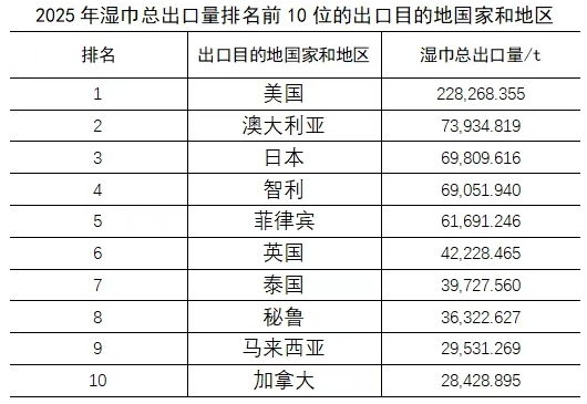 進(jìn)口: 2025年,濕巾進(jìn)口量?jī)H2.71萬t,總進(jìn)口額1.69億美元,進(jìn)口量總體很少,對(duì)國(guó)內(nèi)濕巾消費(fèi)市場(chǎng)的影響較小。進(jìn)口濕巾產(chǎn)品主要為消毒濕巾,進(jìn)口量占比為 88.09%。