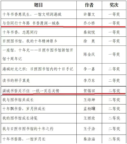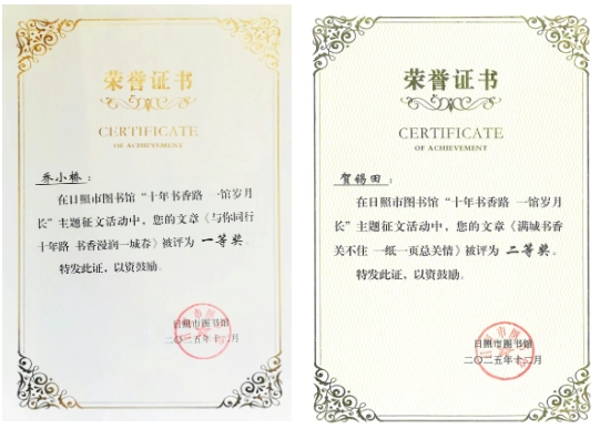 為進(jìn)一步深化廣大讀者與日照圖書館之間的情感聯(lián)接,增強(qiáng)圖書館作為“精神家園”的歸屬感,日照圖書館特開展“十年書香路,一館歲月長”主題征文。近日,征文獲獎(jiǎng)名單公布,公司員工喬小橋作品《與你同行十年路 書香漫潤一城春》、賀錫田作品《滿城書香關(guān)不住 一紙一頁總關(guān)情》榜上有名,分別獲得一等獎(jiǎng)和二等獎(jiǎng)。