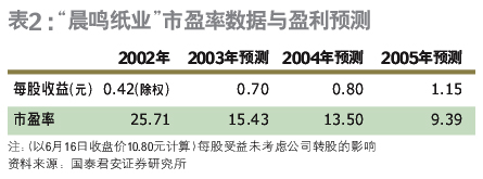 1997年以來,公司以B股上市為契機,通過新建與購并,在短短6年的時間里,使規(guī)模從十幾萬噸迅速超過百萬噸,凈利潤由幾千萬元上升到6億多元,產(chǎn)品結(jié)構(gòu)也由中低檔產(chǎn)品轉(zhuǎn)變?yōu)橐灾懈邫n產(chǎn)品為主。2004年初開始的紙品漲價無疑將提升公司的業(yè)績,基本上可以彌補2003年以來造紙原料價格上漲的不利影響(表2)。