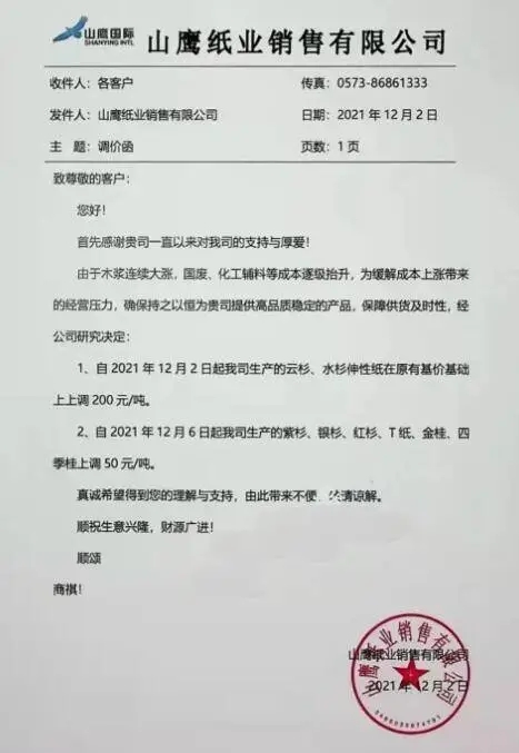 山鷹發布漲價通知(2021-12-03)