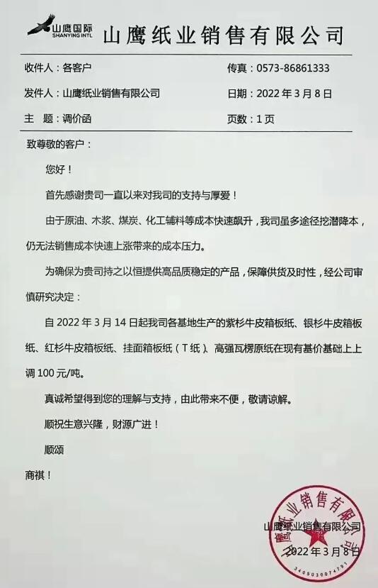 山鷹紙業發布漲價通知(2022-03-10)