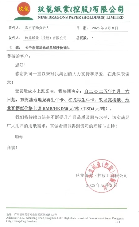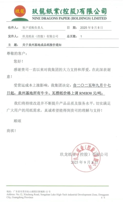 玖龍紙業(yè)泉州基地自九月十七日起,泉州基地所有牛卡、瓦楞紙價(jià)格上調(diào)RMB 30 元/噸。