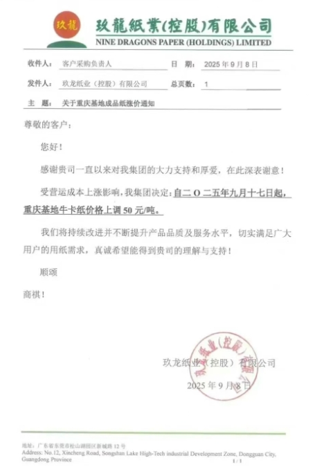 玖龍紙業(yè)重慶基地自九月十七日起,重慶基地牛卡紙價(jià)格上調(diào) 50 元/噸。