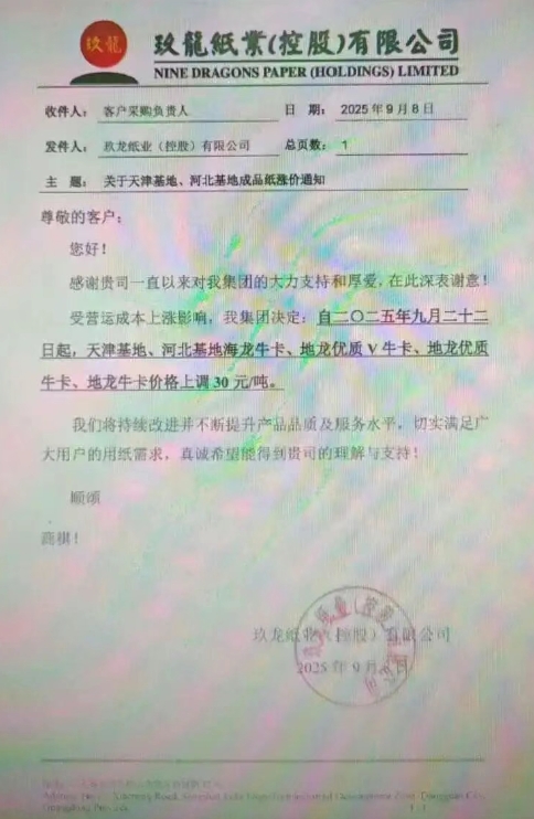玖龍紙業(yè)天津基地、河北基地自九月二十二日起,天津基地、河北基地海龍牛卡、地龍優(yōu)質(zhì)V牛卡、地龍優(yōu)質(zhì)牛卡、地龍牛卡價(jià)格上調(diào) 30 元/噸。