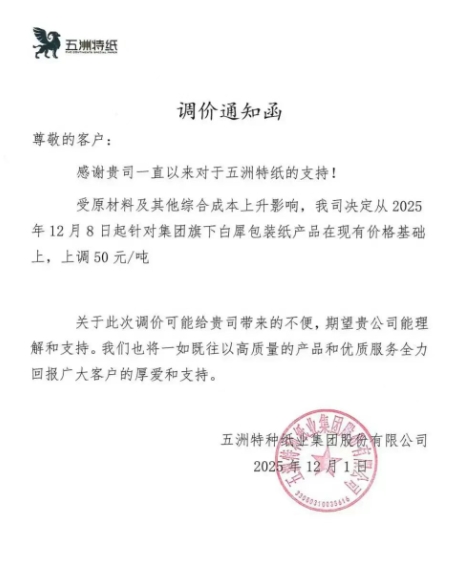 五洲特紙12月漲價函(2025-12-02)